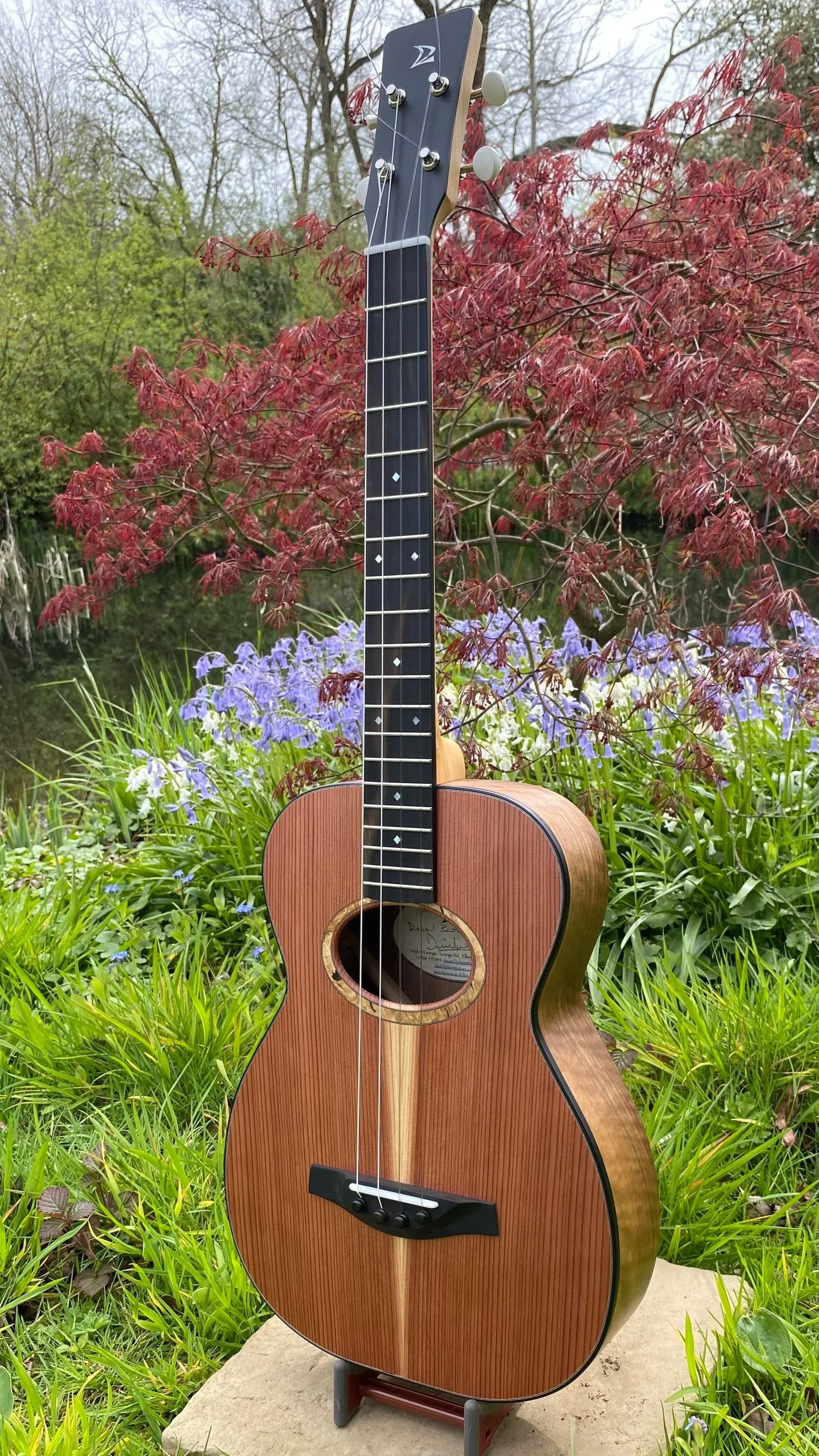 A 20” scale length Baritone inspired by the mainstream US West Coast stringed instruments of the early/mid 20th century - a scaled-up version of our California Style Tenor and reminiscent of a classic Martin OM guitar. These instruments have a ‘softwood’ soundboard (Spruce, Cedar or Redwood) that delivers a real classical guitar like sound with great dynamic range, sustain, resonance and volume. They respond to the lightest touch but deliver power, volume and projection when driven harder. We build these instruments with a variety of different wood options but with an increasing focus on the use of native UK species. Usually strung with a low G but available with a high G if desired.